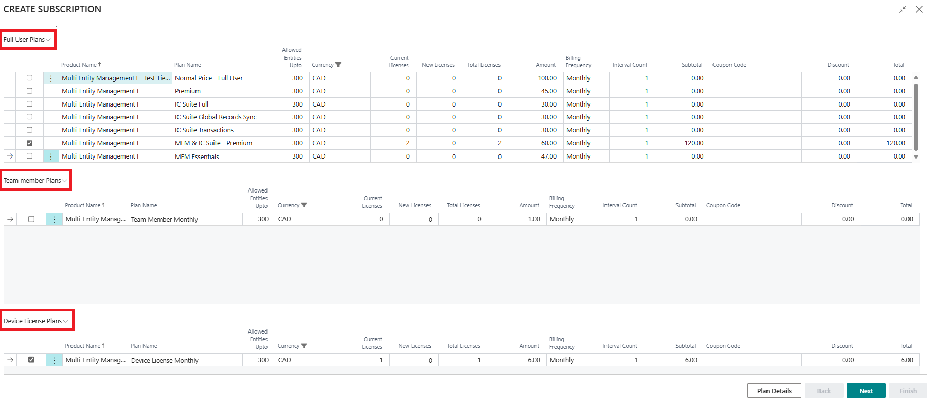 7. For MEM, also make sure that the number of allowed entities matches the quote or is enough for your business needs. For details on the different plans, select Plan Details to view a web page that provides details of the various plans. You can also contact sales for pricing information.